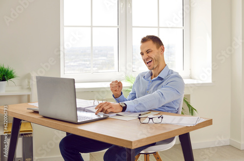 Happy business man celebrating success in office. Young man sitting at working desk, looking at laptop computer, doing fist gesture, and saying Yes, I did it. Success, victory, satisfaction concept