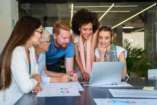 Happy business people, office colleagues having discussion during meeting in conference room.