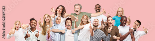 Happy business women and men with sign ok smiling isolated on trendy pink studio background. Beautiful half-length portrait. Emotional people. Human emotions, facial expression concept. Collage