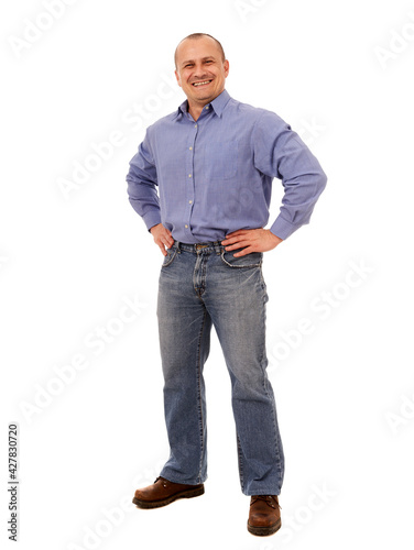 hand, hip, smiling, happy, person, caucasian, male, studio, adult, attractive, photogenic, white, shirt, guy, casual attire, portrait, man, fashion, isolated, jean, background, lifestyle, 1, body, stylish, confident, muscular, standing, masculine, full, length, mature, 40s, fashionable, power, strength, serious, middle-aged