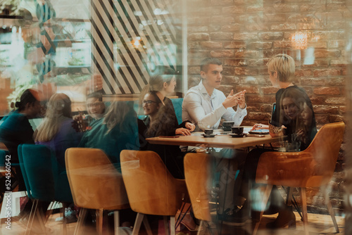 Happy businesspeople smiling cheerfully during a meeting in a coffee shop. Group of successful business professionals working as a team in a multicultural workplace.