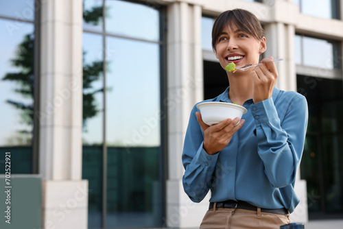 Happy businesswoman with plastic bowl of salad having lunch outdoors