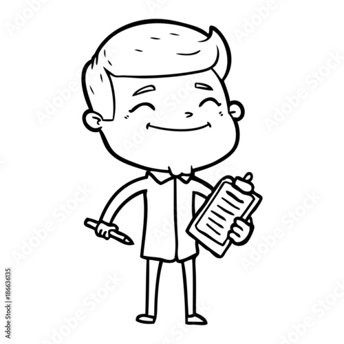 man, male, boy, happy, smiling, smug, cartoon, drawing, illustration, retro, doodle, freehand, free, hand, drawn, quirky, art, artwork, funny, character, taking, survey, note, clipboard