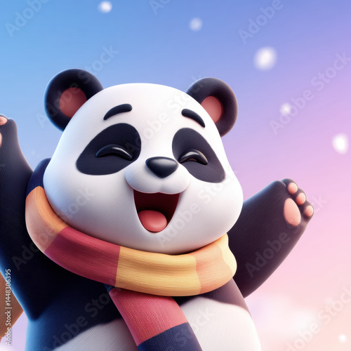 Happy cartoon panda with colorful scarf, celebrating joyfully in winter setting. panda cheerful expression and vibrant colors create delightful and playful atmosphere