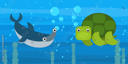 Happy cartoon underwater scene with swimming coral reef fishes illustration