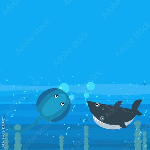 Happy cartoon underwater scene with swimming coral reef fishes illustration
