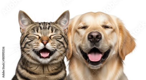 innocent, expressive, togetherness, laughing, companion, friendship, laughter, vertebrate, purebred, joyful, smiling, bonding, canino, playful, mammal, golden retriever, felino, dog, pet, fun, emotion, isolated, happy, studio shot, portrait, cat, adorable, domestic animals, cute, cheerful, domestic, animal, white background, closeup, tabby cat, sweet, animal portrait, best friend