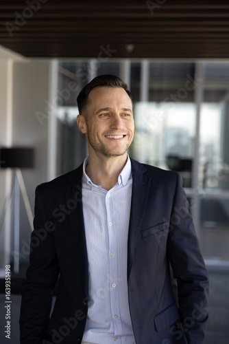 Happy cheerful handsome Hispanic business professional man standing in office space, looking away with toothy smile, keeping hand sin pocket, laughing. Company executive, CEO vertical portrait