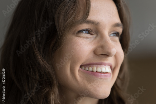 Happy cheerful pretty young woman looking away with toothy smile, thinking, dreaming, enjoying positive emotions. Close up cropped facial portrait of female model with white teeth, brown wavy hair