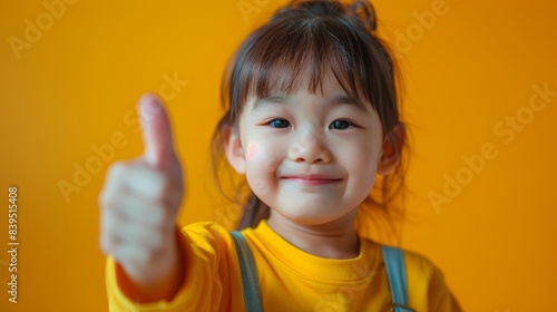 children, thumb, smile, face, happy, joyful, background, yellow, shirt, orange, friendly, sunny, approval, laughter, positive, theme, expression, signal, asian, little, childhood, emotion, radiant, outfit, upbeat, casual attire, portrait, colours, beam, cheerful, fashion, caucasian, wear, head shot, playful, moment, gladness, finger, mood