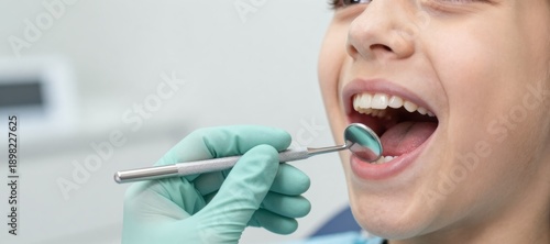 Happy child patient receiving a dental checkup with a mouth mirror in a clinic setting