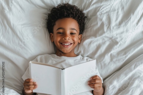 children, book, reading, bed, happy, smile, boy, children, education, learning, literature, childhood, relax, leisure, home, comfort, bedtime, morning, white, bedding, blanket, room, indoor, topview, african american, black, preschool, elementary, student, development
