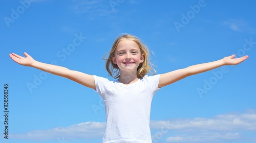 Happy Child with Outstretched Arms Under Bright Blue Sky at Daytime