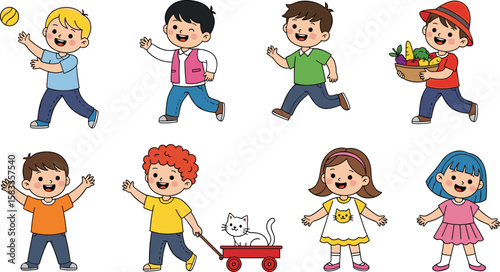 Happy children, cartoon kids, playing ball, pulling wagon, holding basket, cat, fruits, running, colorful illustration, joyful activities, outdoor fun