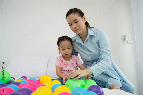 Happy children playing with their parents, having fun with colorful balls.
