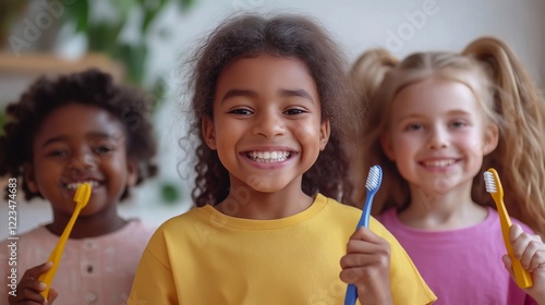 Happy children smiling holding toothbrushes, proudly showing off their clean teeth. The playful setting, the importance of dental hygiene, a cheerful educational atmosphere for promoting oral health
