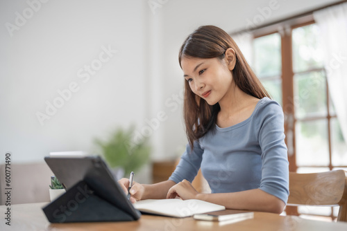 Happy Confident young asian businesswoman working with tablet Start up small business owner. business successful technology concept