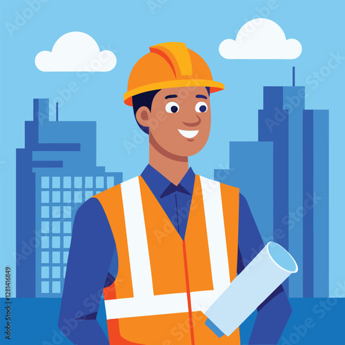 construction worker, architect, engineer, men at work, safety, helmet, blueprint, plan, building, city, urban, happy, smiling, professional, confident, pride, accomplishment, design, architecture, building, construction, construction industry, career, job, safety-gear, illustration, modern, positive, hopeful, employment, construction site, planning, orange, blue, male, man