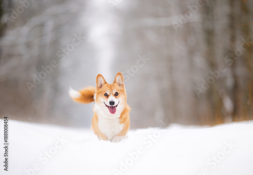 Happy Corgi Dog Running Joyfully Through Deep Snow in a Winter Forest.