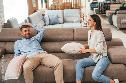 couple, store, sofa, bed, comfortable, client, 2, people, together, lovely, happy, beautiful, gorgeous, male, female, indoor, choosing, looking, casual attire, clothes, talking, communication, renewable, caucasian, european, white, buyer, ethnicity, quality, product, visitor, human, clean, clear, surface, positive, mood, shopping, facial, expression, modern, style, choice, natural, artificial, lighting, calm, tranquil, fun