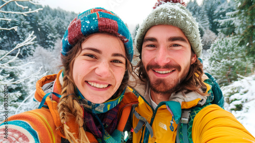 couple, winter, outdoors, adventure, travel, snow, hiking, mountain, happy, smiling, nature, cold, forest, colourful, jacket, hat, beanie, foulard, landscape, seasonal, holiday, vacation, exploration, scenic, frosty, cheerful, joy, bonding, wilderness, trekking, healthy, lifestyle, fun, togetherness, selfie, environment