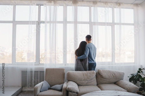 Happy couple hugging looking through the window in living room. New apartments, hotel, estate concept