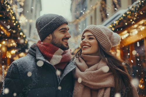 Happy couple laughing and embracing in a snowy city street decorated with festive holiday lights. The scene captures a joyful winter moment during the holiday season. Generated AI