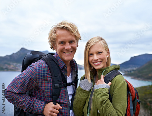 Happy couple, portrait and hiking with backpack on mountain for sightseeing, travel or outdoor journey in nature. Face of young man, woman or hikers carrying bag for trekking, fitness or adventure