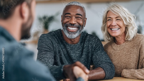 couple, senior, handshake, meeting, agreements, smiling, happy, business, adviser, adviser, professional, success, deal, partnership, trust, human relationships, client, client, interaction, communication, support, assistance, advice, financial, planning, investment, retirement, insurance, real estate, mortgage, contract, discussion, conversation, greeting, welcome, positive, celebration, achievement, together, oneness, diversity, inclusion, people, man, woman, adult, lifestyle, closeup, indoor