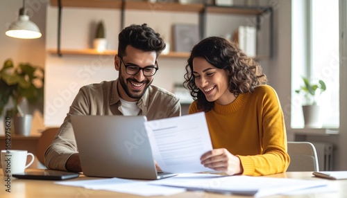 Happy couple smiling while reviewing documents on a laptop at a desk. Warm lighting and plants create a comfortable atmosphere