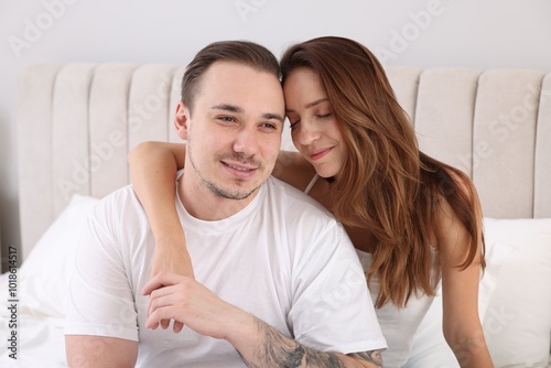 Happy couple spending time together on bed at home
