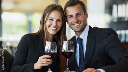 couple, woman, man, smiling, toast, red wine, goggles, celebration, elegant, eatery, dining, joyful, happiness, formal, together, friendship, romance, stylish, love, interaction, lifestyle, human relationships, people, enjoyment, event, luxury, taste, cheer, date, atmosphere, table, beautiful, charme, young, attractive, suit, dress, emotion, connection, socialising