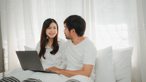 couple, bed, bedchamber, laptop, computer, using, talking, smiling, happy, man, woman, asian, together, love, human relationships, connection, technology, cyberspace, online, morning, home, comfort, relaxation, lifestyle, communication, sharing, browsing, working, shopping, entertainment, news, social, media, information, planning, booking, travel, honeymoon, vacation, cosy, bright, window, natural, light, white, pillow, sheet