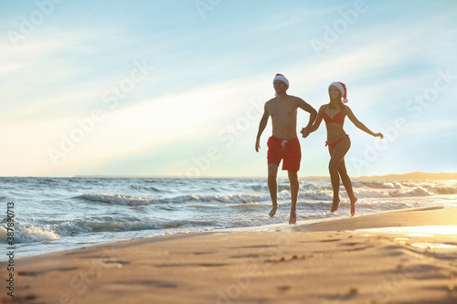 Happy couple with Santa hats together on beach. Christmas vacation