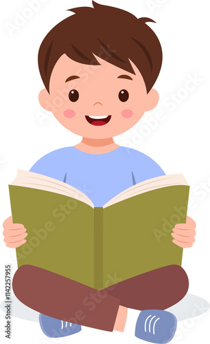 Happy cute boy is holding open book and reading. Knowledge and education concept.Vector illustration