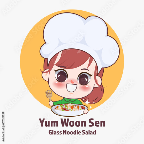 Happy cute girl chef cooking Glass noodle salad Thai food cartoon art illustration.