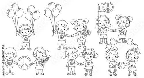 peace, children, friendship, diversity, balloon, celebration, togetherness, happy, children, drawing, illustration, outline, line art, symbol, oneness, joy, innocence, childhood, international, community, hope, love, flower, flag, cartoon, vector