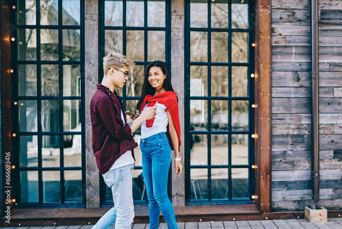 Happy diverse couple walking in street
