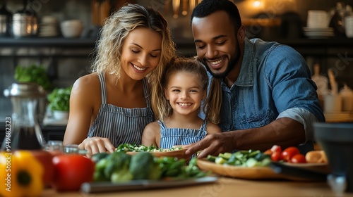 Happy diverse parents with little daughter cooking salad together preparing lunch chopping vegetables sitting at wooden table in kitchen African American mother and Caucasian father wi : Generative AI