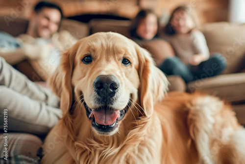 Happy dog in a family setting, indoor activities and laughter, home joy.