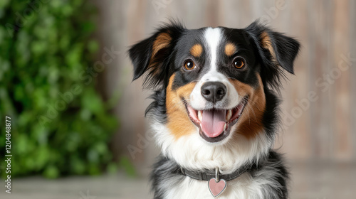 happy dog with heart collar, smiling against bright background