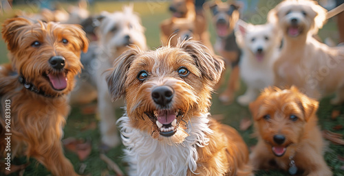 Happy Dogs meeting at a park. Generative AI.