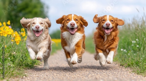Happy dogs running together on a scenic path outdoor pets in nature joyful atmosphere
