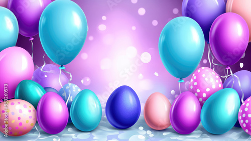 happy easter background with colorful eggs and balloons, including purple, blue, pink, and blue - and - purple balloons, detailed hyper realistic image