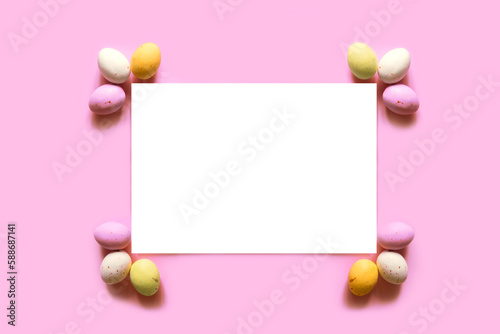 Happy easter decor concept. Blank greeting card, invitation mockup. Festive pastel pink background, chocolates in the form of Easter eggs. Copy space, flat lay, top view.