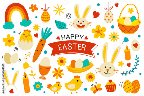 Happy easter elements flat design. Easter set with object and decorations on white background.