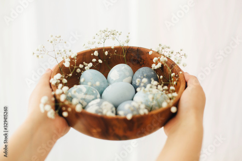 Happy Easter greetings. Hands holding wooden bowl with modern Easter eggs in spring flowers on white background. Stylish pastel blue Easter eggs painted in natural dye from red cabbage.