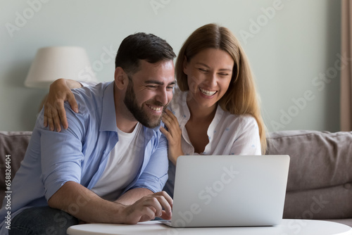 Happy excited millennial husband and wife getting good news from video call on laptop, looking at screen, smiling, laughing, enjoying online communication, using Internet app
