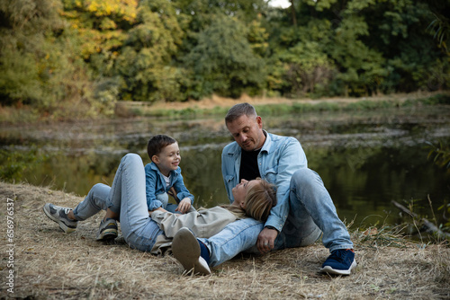 Happy family having fun on the shore of the pond in beautiful golden fall park. Mom, Dad and little child boy having fun near lake or river in autumn. Happy childhood and kid outdoor recreation