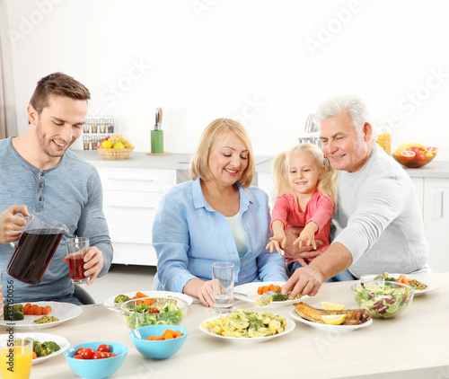 Happy family having lunch in kitchen